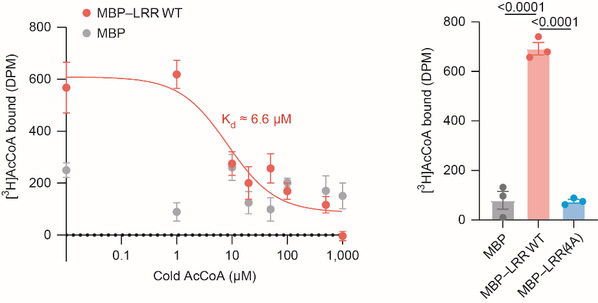 MBP-LRR WT(野生型)与乙酰辅酶A结合Kd值约为6.6 μM。将纯化的重组MBP-LRR WT、MBP-LRR(4A)或MBP蛋白与 2 μM3H标记的乙酰辅酶 A共孵育,通过闪烁计数器检测3H标记的乙酰辅酶 A结合情况。